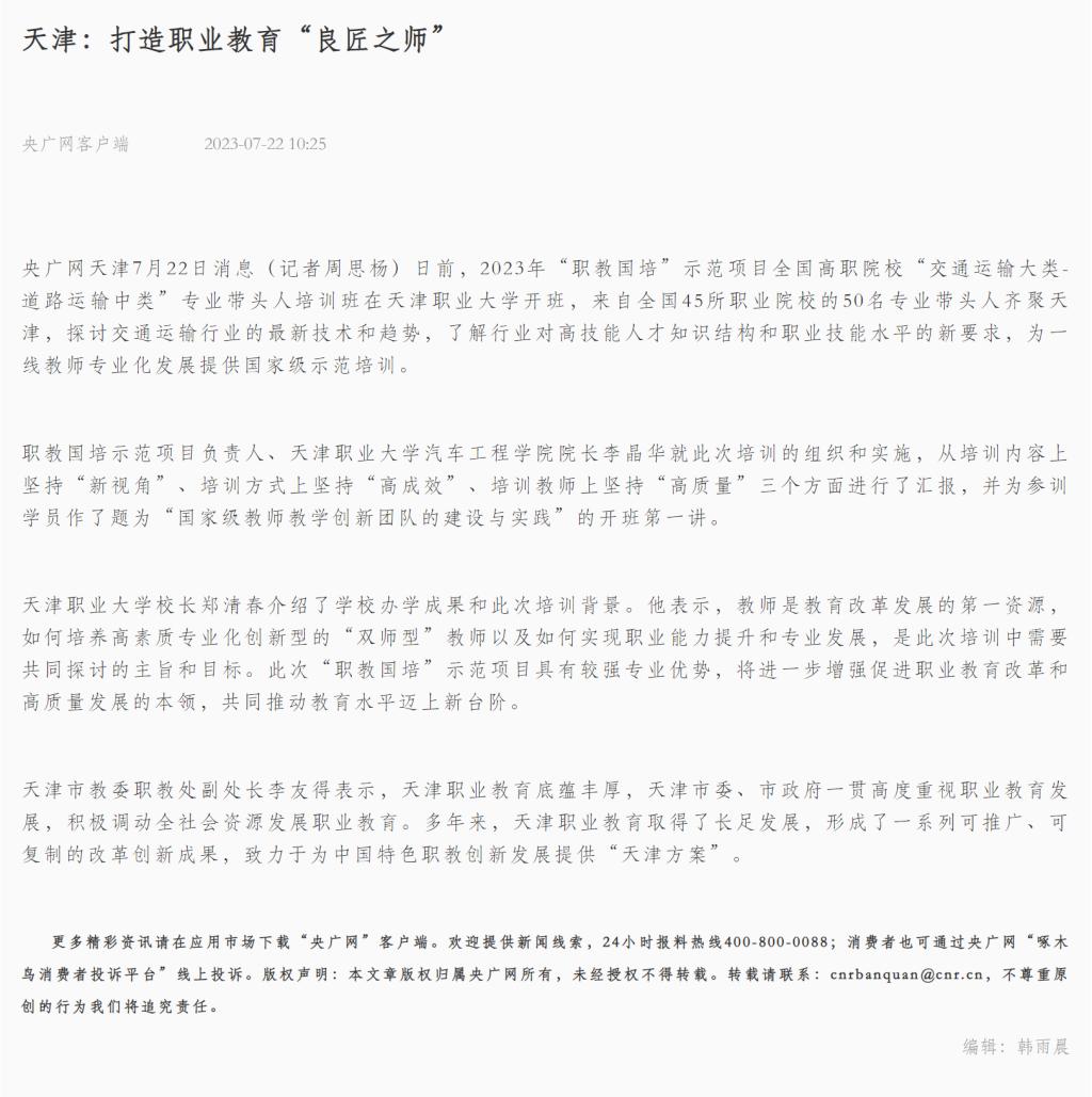 央广网天津7月22日消息(记者周思杨)日前,2023年“职教国培”示范项目全国高职院校“交通运输大类-道路运输中类”专业带头人培训班在beat365英国官方网站开班,来自全国45所职业院校的50名专业带头人齐聚天津,探讨交通运输行业的最新技术和趋势,了解行业对高技能人才知识结构和职业技能水平的新要求,为一线教师专业化发展提供国家级示范培训。