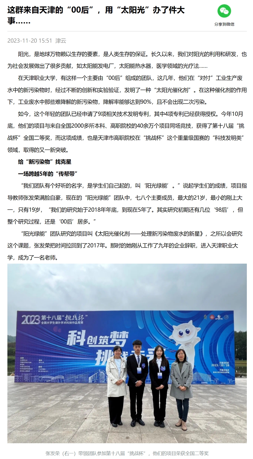 如今,这个年轻的团队已经申请了9项相关技术发明专利,其中4项专利已经获得授权。今年10月底,他们的项目与来自全国2000多所本科、高职院校的40余万个项目同场竞技,获得了第十八届“挑战杯”全国二等奖,而这项成绩,也是天津市高职院校在“挑战杯”这个重量级国赛的“科技发明类”领域,取得的又一新突破。